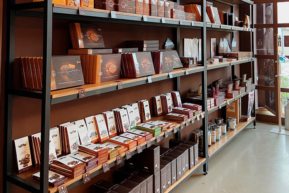 También cuenta con una cafetería y una tienda en la que se pueden comprar y degustar los productos que produce: chocolates, tejas y cigarrillos, gorrotxas, turrones… También ofrece chocolate caliente y café en la propia tienda.
