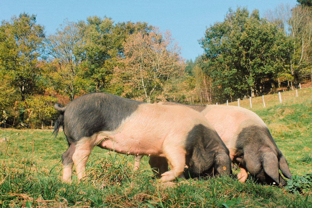 Los cerdos viven en libertad en el bosque, y se alimentan de forma natural a base de castañas, bellotas, avellanas y hierba. Se regula su dieta en los dos meses anteriores al sacrificio y durante el invierno, mediante grano, habas y cereales, nunca transgénicos.