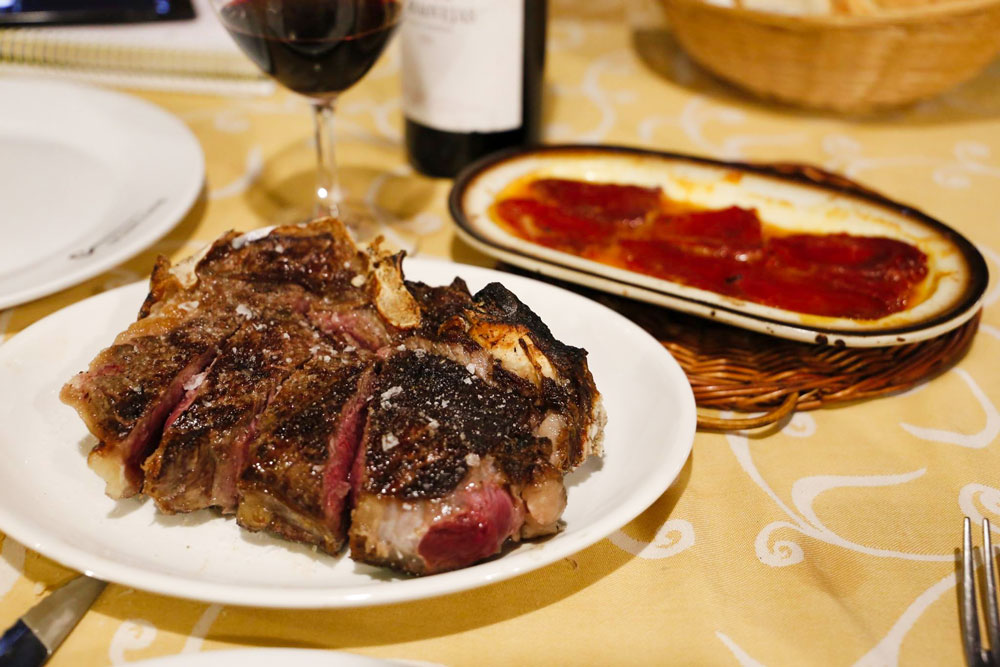 Al comienzo se asaban chuletas de ternera, aunque en la década de los 60 pasaron a la carne de buey: se convirtieron pronto en el plato estrella. También se comenzó a madurar la carne, a lo que hoy llamamos “Dry aged”. Siempre con su fiel acompañante: pimientos confitados.