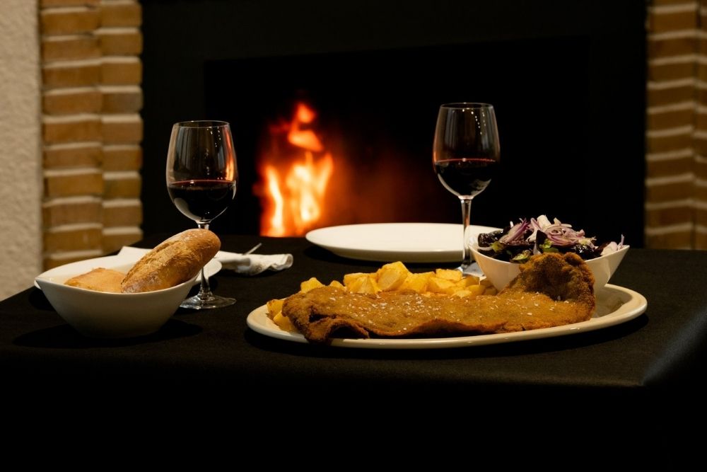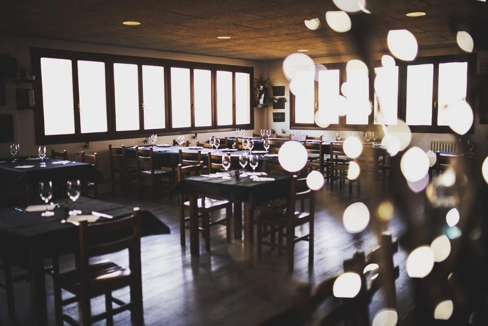 En bar restaurante con amplio comedor con vistas y chimenea.
